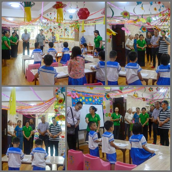 缅华妇协教育中心的校委们和幼儿们热情地迎接各位老师的到来。云南师范大学代表团一行在缅华妇协教育中心的各位校委们、校长张玲玲、园长陈锦华、副园长龚新敏、外派教师赵誉娟的陪同下,参观了本校的环境及三个班级,地理空间信息技术云南省工程研究中心的李灿松副主任对我校的校环境和教室设备赞赏有嘉。纷纷称赞本校丰富多彩的墙面环境。可爱的幼儿班宝贝们为客人老师唱了中、英、缅的儿歌,迎得了客人老师们的阵阵掌声。