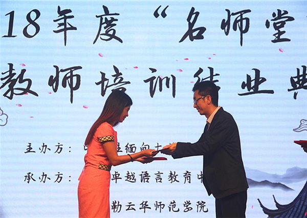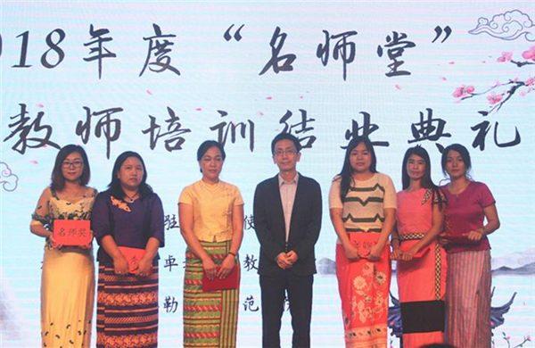 本期“名师堂”由中国驻缅甸使馆主办,仰光卓越语言教育中心与曼德勒云华师范学院联合承办。培训为期 6 周,开设中高级教材教法、国学经典、教育心理学、课堂教学案例等课程,共有 35 位学员完成全部培训并顺利结业。根据综合考核成绩,评选“名师奖”一名,优秀奖二名,鼓励奖三名,于边疆参赞为获奖学员颁发证书及奖金。