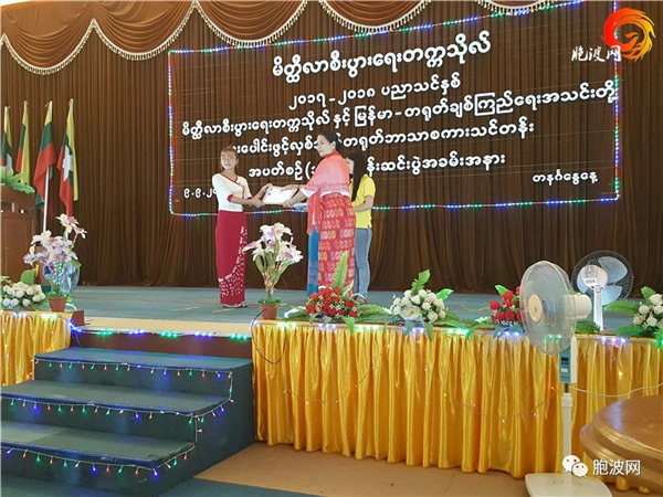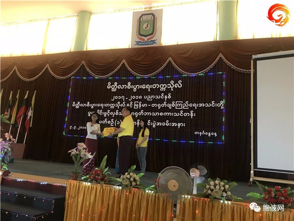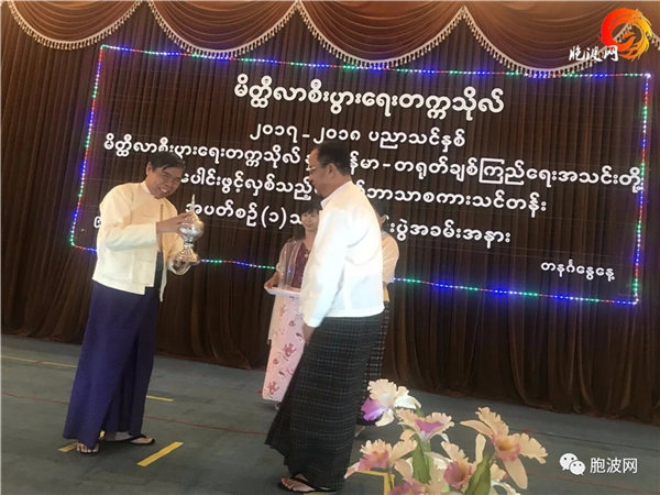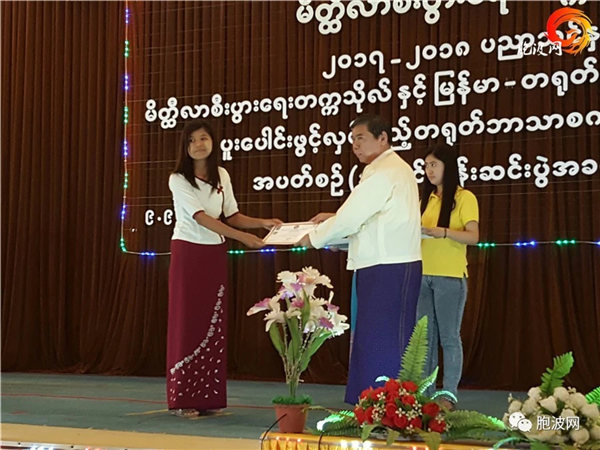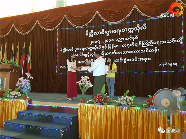 接下来,领导们为学员们颁发了结业证书,并对优秀学员颁奖。密铁拉经济大学教授昂温博士还代表密铁拉经济大学向缅中友协赠送纪念品。