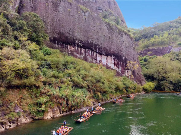 第二站:武夷山。我们登天游峰时,导游告诉我们说:“不登天游,虚此一游,不坐竹筏,白来武夷”,我们听后很惊讶。我们登到半山腰时,山很陡,但风景很美。第二天,我们一大早就去九曲溪坐竹筏。划竹筏的师傅跟我们说:"现在我们坐的这条溪是九曲溪,因为一曲有两个弯所以也叫“九曲十八弯”。在竹筏上,师傅跟我们讲了许多关于那里的历史、文化和生活;观看“印象大红袍”山水实景演出,高科技展示的不一样的山水风光之美,让我们大饱眼福;近200多人在湖上拿着竹竿撑船跳舞,所有的活动都令我惊奇和难忘。