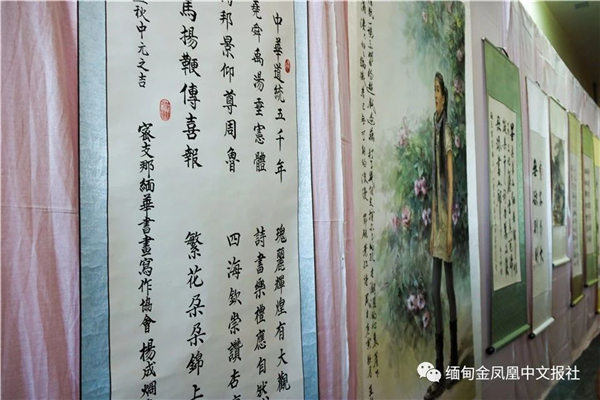 开幕式结束后,各国代表团共同参观了书画展,书画展展出缅华文艺界书法、绘画、篆刻等诸多作品。