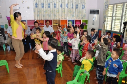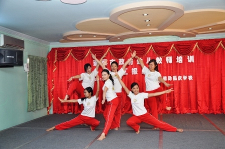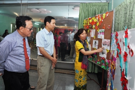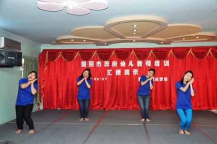今日上午8时,于曼德勒福庆孔子课堂举办瑞丽市政府支持的幼儿教师培训结业典礼以及汇报演出。驻曼德勒总领事馆吴毅领事、雷洋领事、福庆学校董事长黄鹏飞先生以及各位董事,福庆学校师生,参加培训的学员们参加了仪式。幼儿教师们纷纷地表演了学到的民族舞蹈、体操、儿歌表演,手势表演等节目。表演结束后,领导们观看了学员们的手工成果,又于福庆福娃娃幼儿园展示公开示范课,精彩生动的示范表演获得了领导们的高度肯定和赞扬。这是一次跨国交流的新突破。