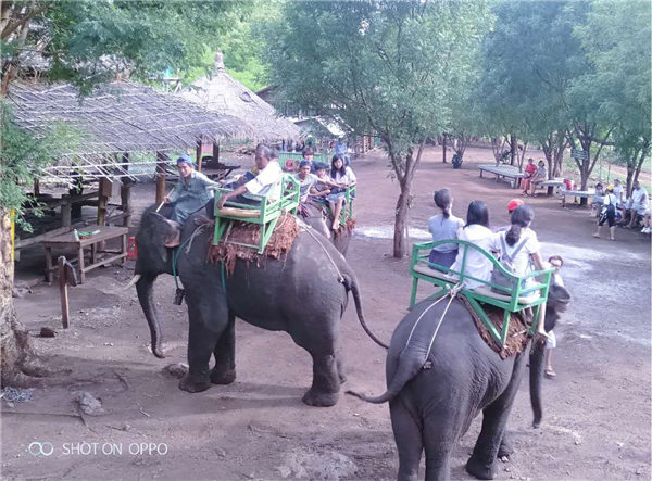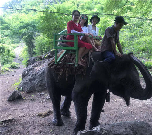 休息片刻后,一部分家长、孩子和老师们继续出发到达第二站--五英里大象园。刚下车,就看到两边高大的树木郁郁葱葱,景色十分优美。看到几头大象正载着游客,我们拿着食物慢慢靠近大象,只见大象鼻子一卷就吃到了食物。宝贝们和自己的爸爸妈妈体验了一次骑大象的经历,真是不一样的体验。