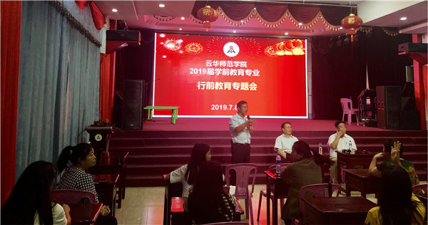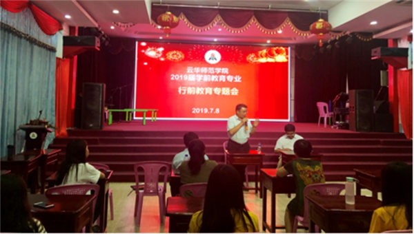 2019年7月8日晚,缅甸云华职业学院学前教育专业行前会在云华师范学院四楼礼堂举行,云华师范学院尚兴玺董事长,院长李暾教授、甘雪莉副院长、马从源院长助理,师范部德育主任丁浩老师,后勤管理部叶素欣老师,学前教育专业大一、大二年级学生和班主任参加了会议。