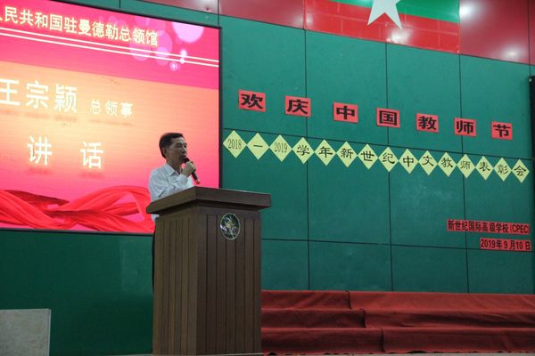 王宗颖总领事在讲话中,高度赞扬新世纪教师远离故土,离开亲人,来到曼德勒,立足三尺讲台,春播夏耘,为缅华社会培养了一批又一批的人才;新世纪楼宇高耸,环境优美,师资队伍不断壮大,硕果满枝,得益于新世纪教师的辛勤付出,凝聚着张旺后董事长、张继校长及在座各位的辛勤耕耘和苦心孤诣。他还鼓励大家:“教书育人是教师的天职。为人师,既要教书,又要育人;既要言传,更要身教。新世纪一定能继续坚守有教无类,秉承中华传统美德,保持对教师这个职业的敬畏,做好学生健康成长的引路人。”