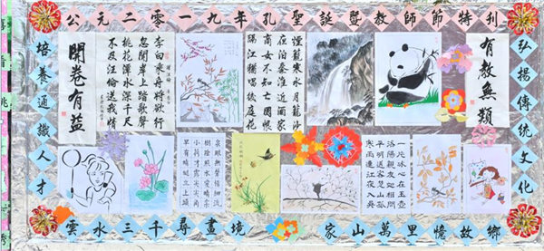 学校为到场嘉宾、家长及学生准备了午餐。餐后,嘉宾、家长在学生的带领下参观了由师生共同完成的壁报。壁报展示了我校师生的书法、绘画技能。