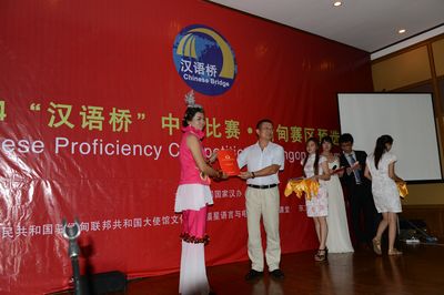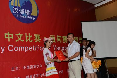 今天在缅甸赛区预赛得到冠军者将到中国参加汉语桥世界大学生、中学生的比赛。
