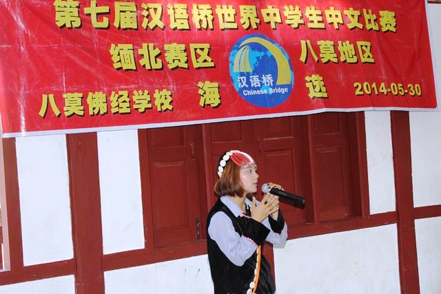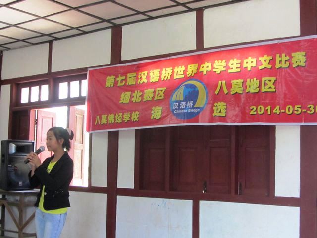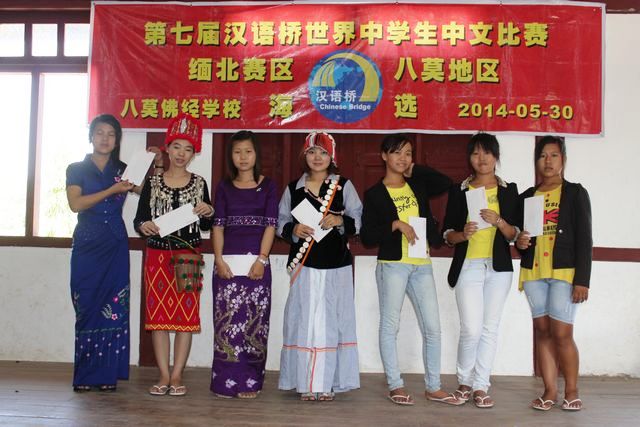 第七届“汉语桥”世界中学生中文比赛缅北赛区,八莫地区海选预赛于2014年5月30日(星期五)上午9:00在八莫佛经学校举行。参赛人员来自八莫七英里学校和八莫佛经学校的中学生,他们中有华裔汉族和克钦景颇族。