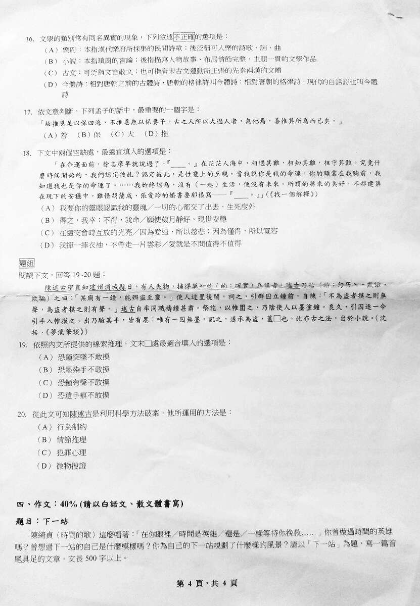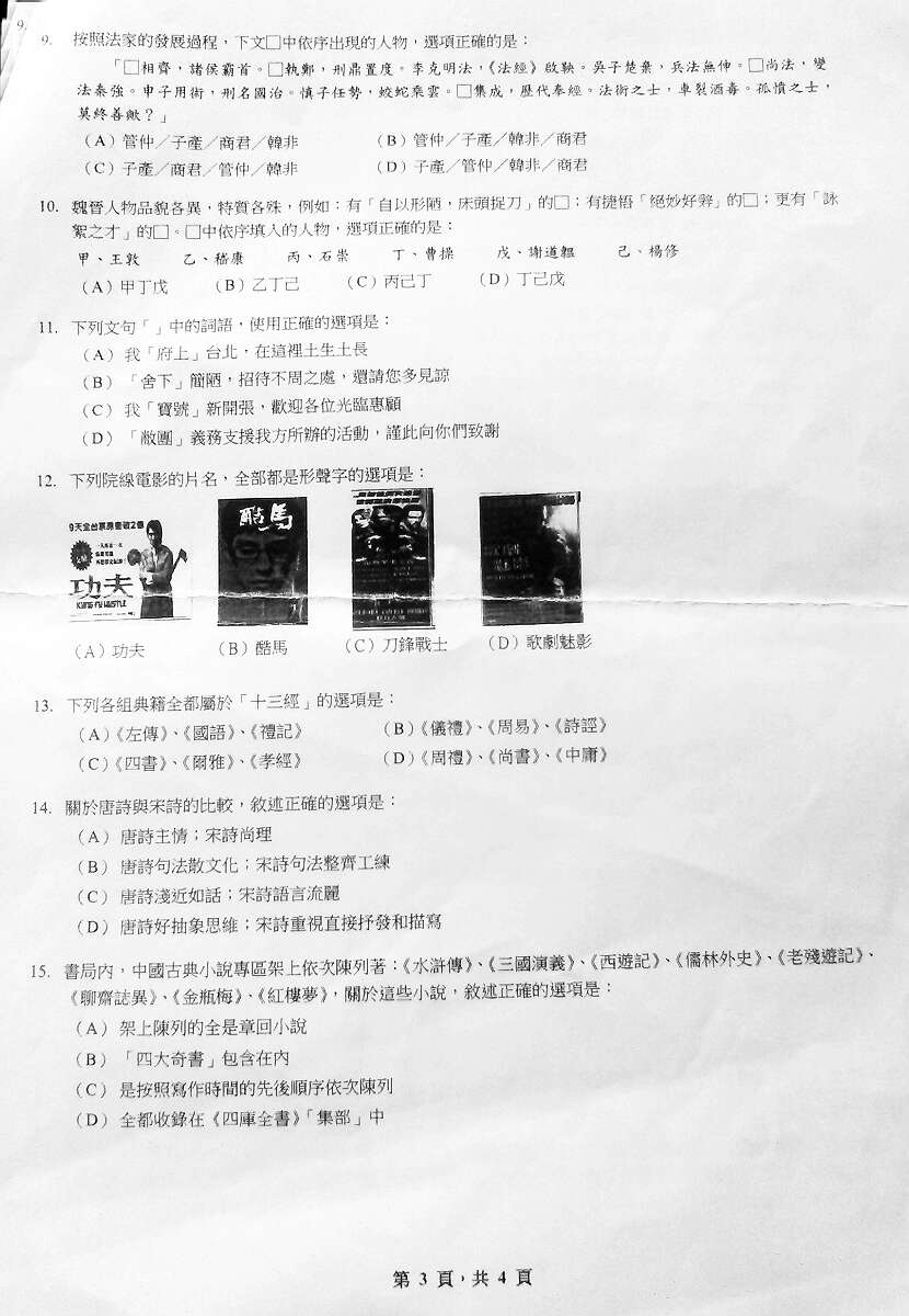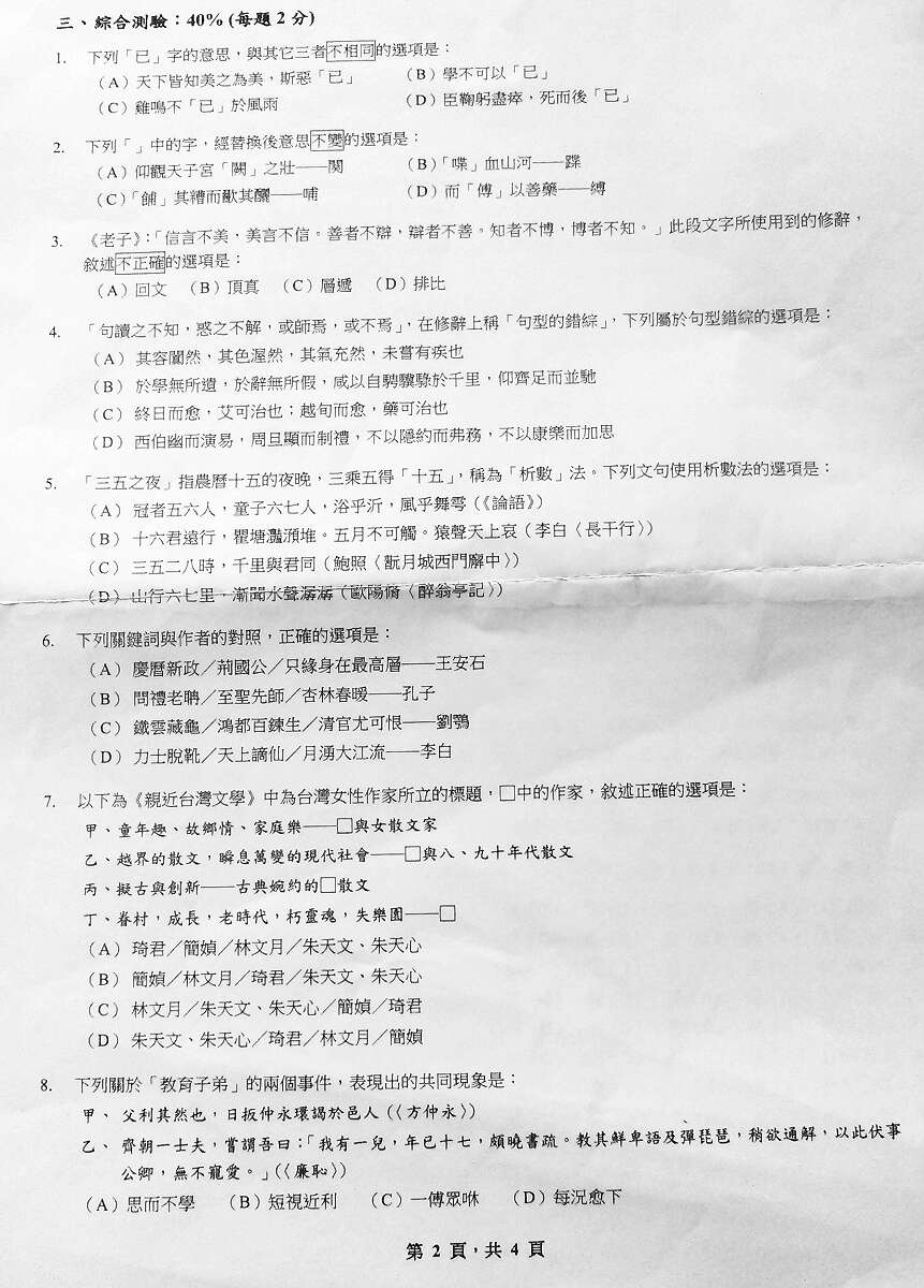 对这一道题,我沉思良久。不知现在台湾方面规定的高中语文课本中有没有这样的文章。假使没有,学生也没读过相关作品的话,这要选哪一个答案,确实不容易决定。我自己本身就根本不知道要选哪一个答案,故只好臣服于带这考题来的李老师,请他多多加以指教。