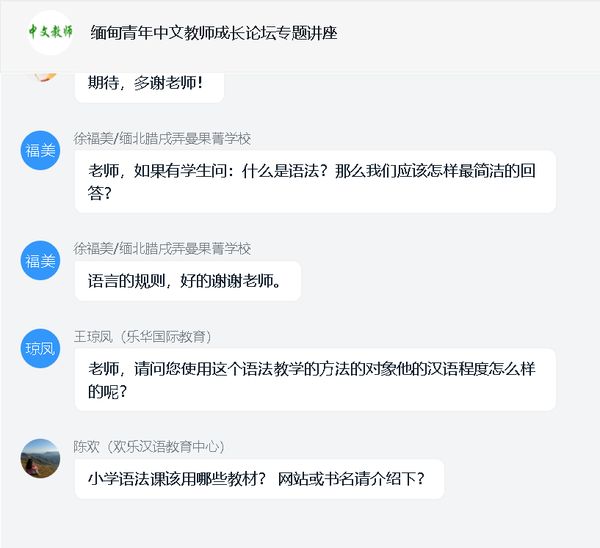 据了解,此次论坛专题讲座为期八天,讲座的主题涉及汉语语法、中国文化、儿童心理学、教师生涯规划、教学视频及课件制作。活动吸引了来自缅南地区的缅华妇协教育中心、欢乐汉语教育中心、庆福华文学苑、博文学校、Chue Chue汉语培训班、缅甸国际教育中心MIEC、乐华国际教育、顺达语言培训中心、义联学校、圆满学苑、绿光学院、神墨学校和缅北地区腊戌黑猛龙中学、双龙中学、当阳孔圣中学、腊戌圣光中学、弄曼果菁学校等21所华校和培训机构的150多位老师报名参会。受新冠疫情影响,本次论坛讲座全程采用线上方式举行,并由福星孔子课堂通过其Facebook官方账号全程直播。