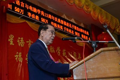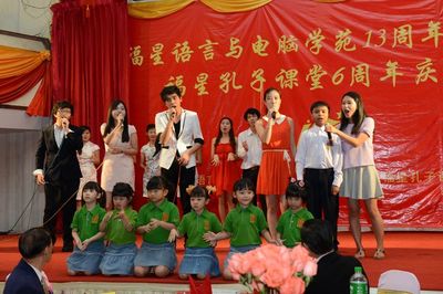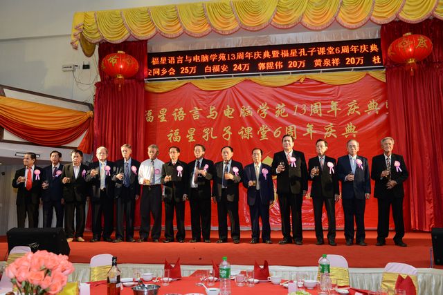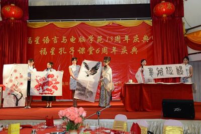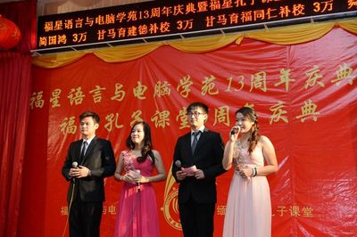 仰光福星语言与电脑学苑创办十三周年暨福星孔子课堂创办六周年的庆典活动于2014年10月21日下年六时假座梅花皇宫大酒家举行联欢晚会,缅华各界侨团代表、社会贤达到场热烈祝贺,筵开八十多席,情况非常热闹。
