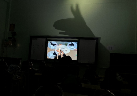 随后的“手影变变变”环节将课堂气氛推向高潮。杨蓉芳老师率先示范,双手灵活变换,小鸟展翅、小狗摇头、蜗牛爬行、骏马奔腾等生动的手影形象跃然投屏。孩子们兴致勃勃地模仿学习,小手掌在灯光下翻飞舞动,一群群灵动的“小动物”瞬间“闪现”。孩子们举一反三,创造性地做出花朵、飞机等独特手影,在实践中发现:光离遮挡物越近,影子越大;光离遮挡物越远,影子越小的奇妙规律。