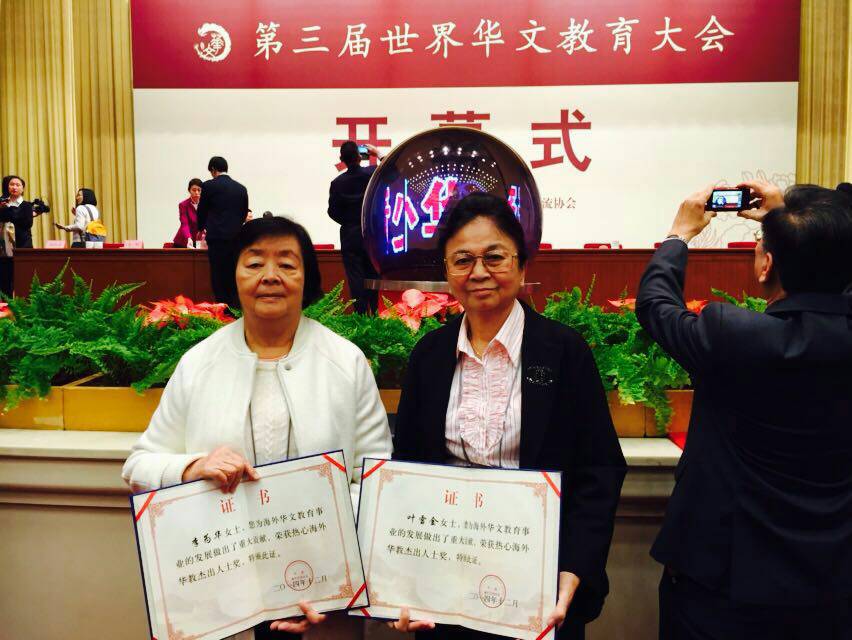 裘援平主任做主题报告后,接着举行海外华文教育示范学校的授牌仪式,我校也荣获海外华文教育示范学校校牌。这就意味着我校一步一步迈向正规化方向发展已得到了大家的认可。我非常荣幸地能和获得海外华文教育示范学校的世界各地区的代表一起上台接受校牌,这是我一生最大的光荣,也是九龙堂天后华文学校的光荣。缅华妇女协会主席李为华和缅华妇女协会教育中心校务主任叶雪金荣获热心华教杰出人士证书。她们终于获得了为华文教育发展而默默做出贡献的硕果。
