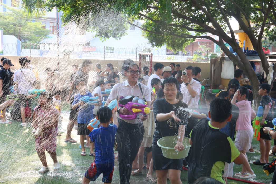 随着广播里欢快的DJ音乐响起,节日气氛被迅速点燃。师生们聚集在草坪上,手持水盆、水枪等工具,迅速投入到节日氛围之中。清澈的水花在阳光下划出一道道闪亮的弧线,泼水声、欢笑声与音乐节奏交织在一起,现场瞬间化作一片欢乐的海洋。同学们奔跑嬉戏,互相泼洒着象征祝福的清水;师生在泼水祝福中拉近距离、增进情谊。
