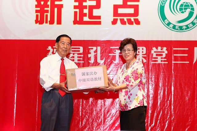 庆典期间,福星孔子课堂副理事长苏一新先生和福星孔子课堂中方院长郑芾夫先生向仰光各汉语教学机构赠送了中国国家汉办专门针对缅甸编写的中缅双语教材。