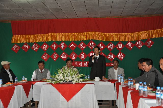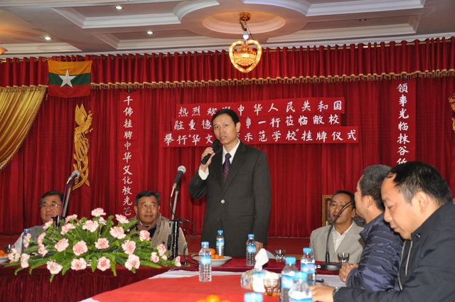 学校领导对总领馆、汉办、侨办、福庆学校领导代表的到来,表示欢迎。据悉,这是红宝石城抹谷,首次迎来了汉办、侨办的代表。吴毅领事传达了近期在北京召开的第三届世界华文教育大会的精神;孔子课堂中方主任何林教授,介绍了汉语国际推广以及HSK的重要性;海外华文教育中心唐建军主任,介绍了侨办的各类活动,并对长期以来为华教努力的校领导师生表示敬佩;李祖清校长详细介绍了前往中国深造的各类奖学金情况,呼吁年轻教师努力充实自己,回报社会。还呼吁各校努力推广HSK,搞好华教汉教的同时,努力促进缅中两国友好关系;各华校领导对各自的情况与面临的困难也纷纷做了发言。