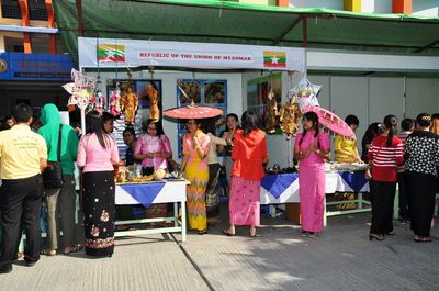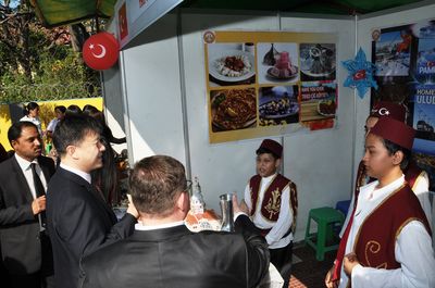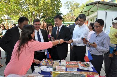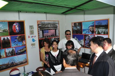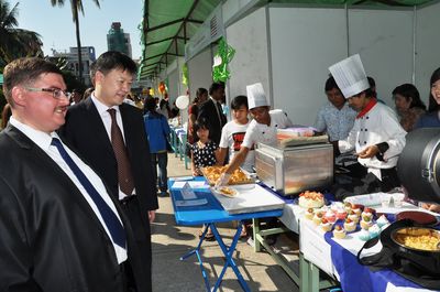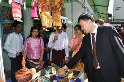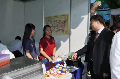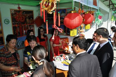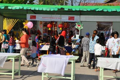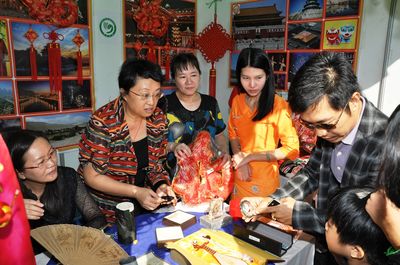 中国展馆以浓厚中国文化,如:脸谱、中国结、灯笼、中国风景图片等作为装饰背景,展示了算盘、围棋、文房四宝、中国扇子、纪念礼品等独有中国风味的产品,还介绍了对外汉语新颖教材及书籍。学生们还积极地做出饵丝、面条、饺子等中国食品,将中国食品与纪念礼品进行出售。据悉,总领馆此次活动中,售物所得款,将全部捐助给寺庙教学点、孤儿院等。