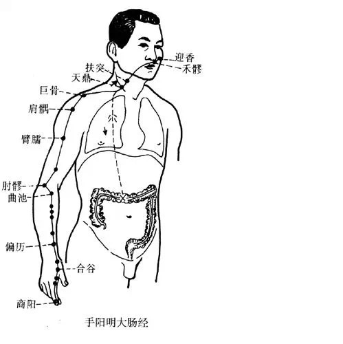 4、手阳明大肠经共有20个穴位,这条经脉主要与人体的消化系统相关,消化系统出现了问题,人就会"上火",喉咙、牙齿就会疼痛,脸上就会出现痤疮、雀斑、酒糟鼻等。刺激拍打手阳明大肠经上的曲池、三里和合谷等穴位,则可以治愈肠胃疾病和眼、耳、口鼻、喉等五官疾病。例如,耳聋、齿痛、咽喉肿痛、腹胀、腹泻、口眼歪斜、便秘、经闭、水肿、上肢不遂、高血压等。