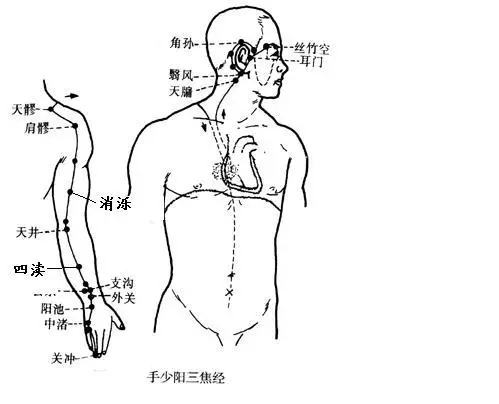 6、手少阳三焦经有23个穴位,这条经脉不畅,身体就会出现耳聋、耳鸣、耳痛和咽喉痛。拍打疏通这条经脉,则可以治愈耳聋、耳鸣、耳痛、目赤肿痛、水肿、小便不利、遗尿以及肩臂疼痛等疾病。