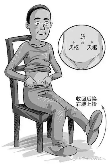 天枢穴位于肚脐旁2寸处,为左右对称两穴。它主疏调肠腑、理气行滞、消食,是腹部要穴。两腿并拢坐在椅子上,按压天枢穴,左腿尽量向上抬,然后收回,换右腿上抬、收回为1次,反复做5次。在大便时,可以用左手中指点压左侧天枢穴,至有酸胀感时按住不动,坚持一分钟左右即有便意,然后屏气增加腹内压力即可排便。