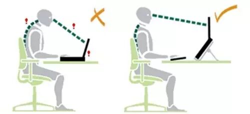 电脑设备应该放置在你手臂长度的位置,应低于你视线的15~30度;在你打字时,小臂应与大臂形成90度角,你的小腿应与大腿形成90度角,坐立时,挺胸,胸部和头部应在一条垂直线,每30分钟应站起休息缓解3~5分钟。