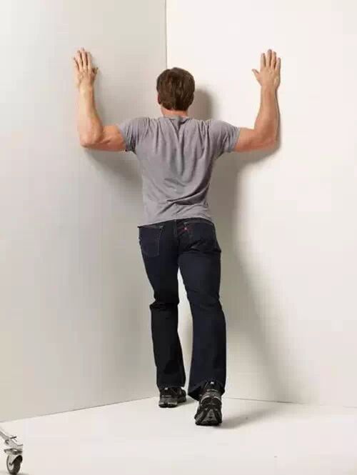 找一个凸出的墙角,将你一侧的手臂水平搭扶墙上,转动、前倾身体,将搭扶墙壁一侧手臂向后延伸,使拉伸一侧胸部有明显拉伸感,配合呼吸,呼气时缓慢将胸部向前推出,保持30秒,休息,重复进行3次,换另一侧进行。严禁使用弹震式拉伸。
