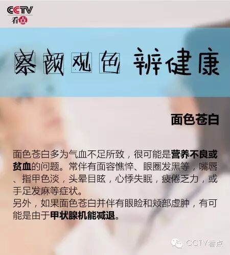 大家都知道,中医中有“望闻问切”的诊断手法。“察颜观色”正是医生对病人的身体状况初步判定的手段。除了面色,脸上其他部位也能作为断病的辅助: