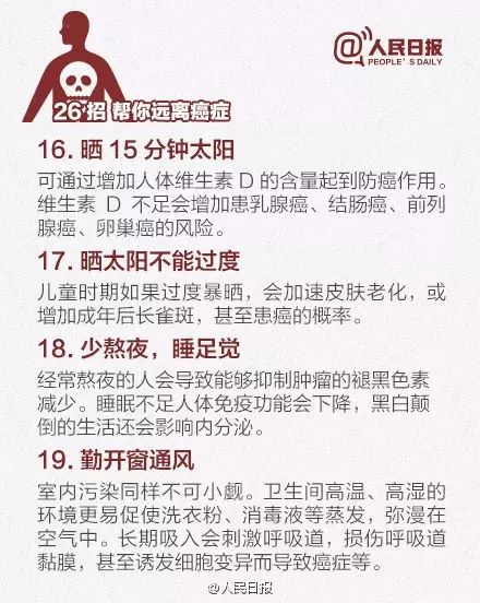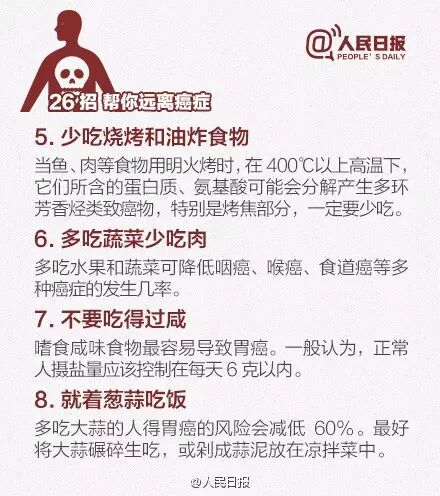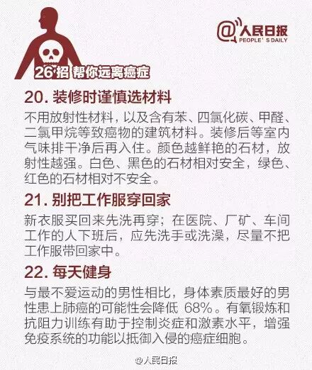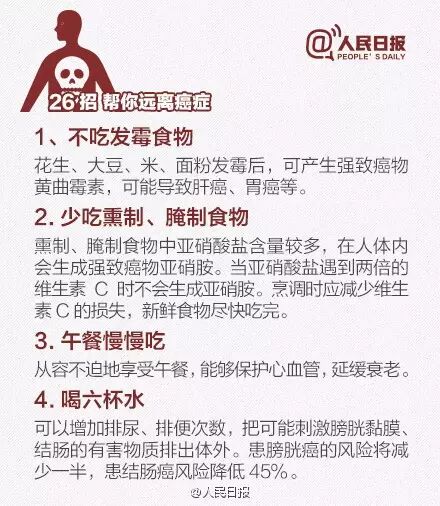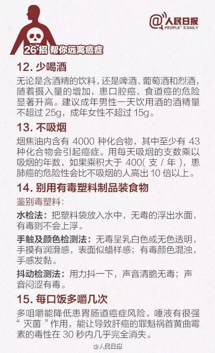 日前,首都国际癌症论坛召开。据介绍:①2012年有关报告显示,我国每年新发癌症病例约337万,死亡约211万;②癌症已成为我国死亡第一大原因,因癌死亡人数占全球1/4;③高脂肪、高热量、少运动等不良生活方式成重要诱因。送给你防癌26招,一定要知道!