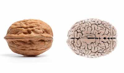 2. 核桃——大脑 核桃就像一个微型的脑子,有左半脑、右半脑、上部大脑和下部小脑,甚至其褶皱或折迭都像大脑皮层。目前人类已经知道,核桃含有36种以上的神经传递素,可以帮助开发脑功能。