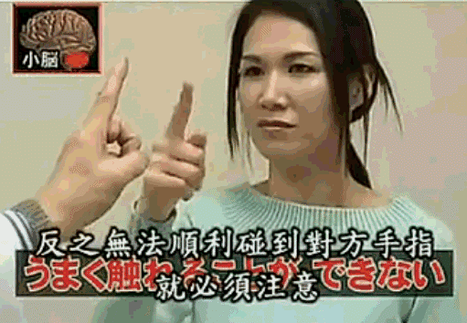 ▲ 请一个帮手,站在自己面前竖起一根手指;然后重复触碰对方的手指和自己的鼻尖;对方的手指可以变动位置,如果速度变快也能点中对方的手指则没有问题。