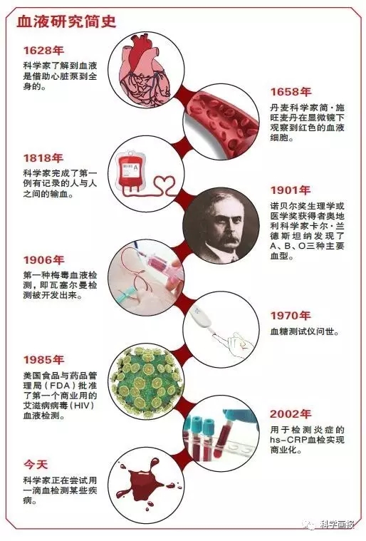 验血是体检和看病的常规项目。研究已经证实,每滴血都可提供众多翔实信息。有专家认为,血液中的有用信息是基因组的10倍,甚至100倍。随着科技的快速进展,血液检测的应用范围得到极大拓展。目前许多科学家和公司都在努力挖掘血液检测的巨大潜力,以通过验血来洞悉隐藏在体内的健康问题。