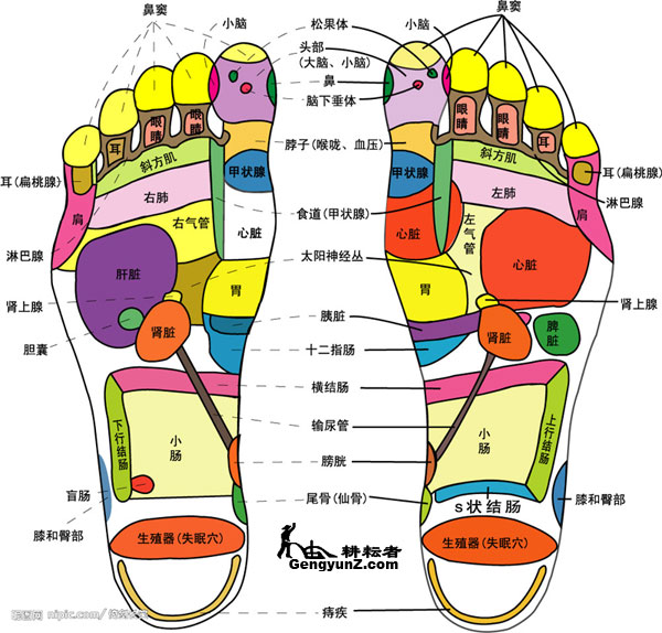 从中医角度讲,人的双足具有运行气血、联络脏腑、沟通内外、贯穿上下的功能,每个人双脚上有60余个穴位,均与全身器官有相应关系。因此脚部的一些变化也能反映出身体的状况。