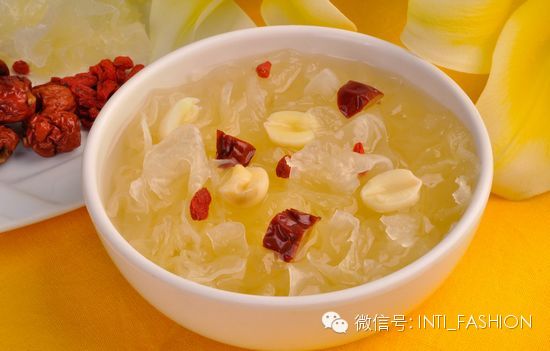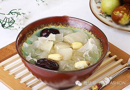 银耳雪梨汤:选50克银耳,梨两只。将梨切块,银耳加水500毫升,煮开20分钟即可,加冰糖少许,饮用有润肺止咳之功效。