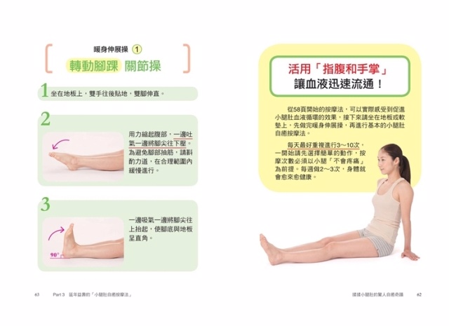 把握「由下往上按、腹式呼吸」2大原则,就能随时改善手脚冰冷、增强免疫力!用手指【轻捏】可以软化硬块,【姆指交迭、抓握环绕】能按压深层肌肉,用【膝盖】摩擦小腿,徒手也能刺激穴道,深层按摩后搭配「小腿放松操」,每周做2~3次,就能让身体愈来愈健康!