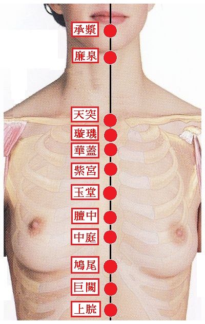 左手四指微并拢,以掌根放于胸中上端,左拇指放于右锁骨上,自左横线来回擦动,直擦至乳头上水平线。往返数次后,换右手仿效上法擦左胸,坚持揉按膻中、鸠尾、巨阙三穴。用多指揉、擦胸胁部。拇指点按内关、鸠尾、巨阙三穴各1~2分钟。右手五指并拢,略屈,用虚掌拍击左胸,重复20~30次;换左手拍右胸,使两侧肺部都拍到。以右手拇指紧贴左胸外侧,其余四指紧贴腋下,作相对用力提拿;配合呼吸,吸气时用力提拿,呼气时慢慢放松。重复5~10次。换左手拿右侧胸肌,以酸胀为宜。
