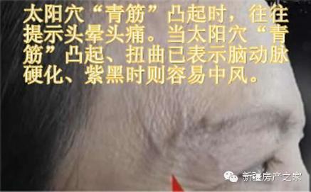 1.当太阳穴青筋凸起时,往往提示头晕,头痛;当太阳穴青筋凸起,扭曲时,表示脑动脉硬化;紫黑时,则容易中风。