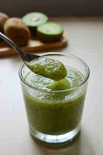 1、猕猴桃洗净,对半切,用勺子挖出果肉,放入料理机。