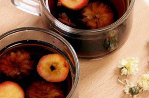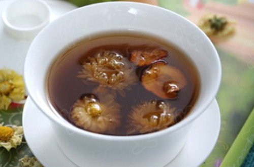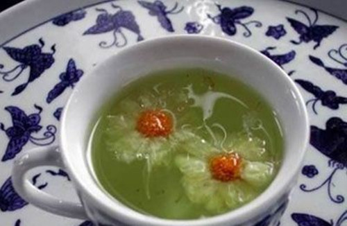 做法:将菊花放入水中煮沸,然后将柠檬汁和绿豆沙汁注入菊花水中搅拌,最后放入少量蜂蜜即可饮用。
