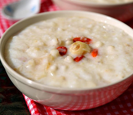 食材:薏米20g、粳米60g、牛奶200ml、莲子15g、枸杞5g、糯米30g