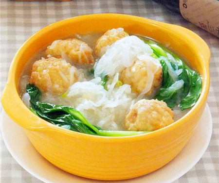 食材:白萝卜半个、粉丝25g、油适量、盐适量、藕丸适量、油菜适量、葱适量、香油适量、胡椒粉适量、鸡精适量