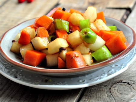 做法:1)准备食材。 2)红萝卜白萝卜切成小丁,加一小勺盐腌一下。 3)腌出水份,倒掉不用。 4)锅中放香油,加入干红椒和花椒慢火炸香。 5)将炸好的香辣油浇在萝卜丁上。 6)加入三勺味极鲜,两勺米醋,半勺糖。 7)加入糖。 8)加入尖椒段拌匀即可。