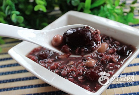 食材:红枣10枚、红豆50g、黑米90g、糯米80g、花生25g、冰糖适量