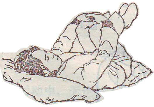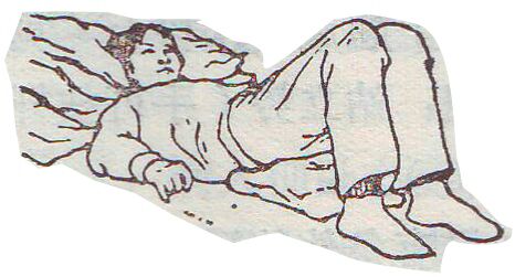(2)仰卧沉腰法:病人仰卧在高枕上,臀尾骨部垫一个枕头,双腿屈在胸前,双手抱住,腰部自然下沉十五分钟以上。这种姿势可以使腰椎后缘间隙增大,利用韧带的动力,把突出的骸核推入椎间盘间隙内。