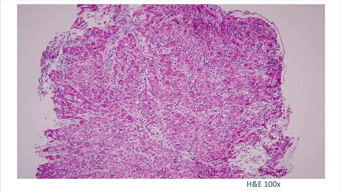100倍还不是看得很清楚,放大400倍就很明显了,一个个蓝点就是淋巴球。这是很厉害的猛暴性心肌炎,整个心脏都被淋巴球浸润了。