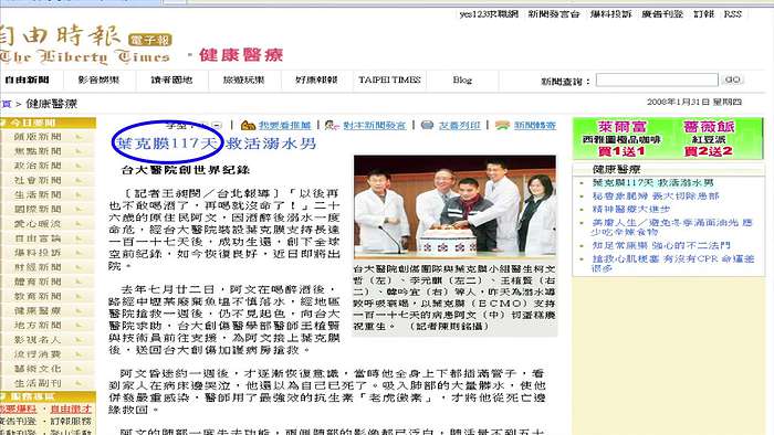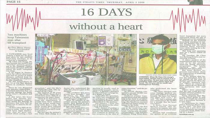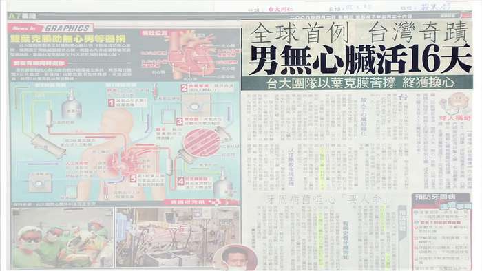 这是另外一个案例,报纸写"全球首例,台湾奇迹,男无心脏活16天"。