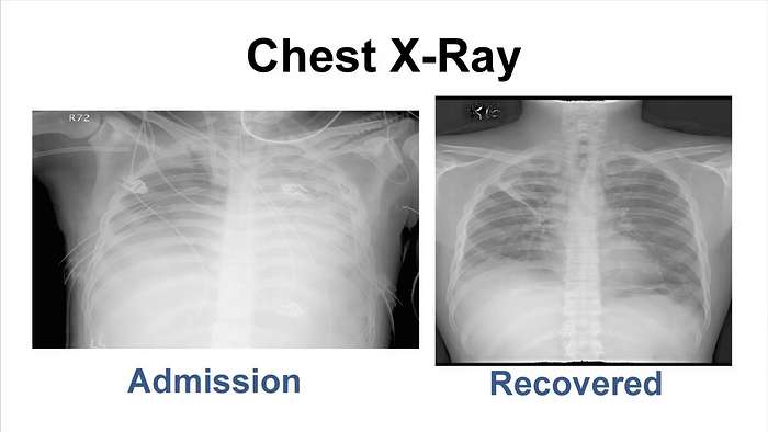 可以看到,他得了很严重的肺炎(又称急性呼吸窘迫征),整个肺都白掉了。