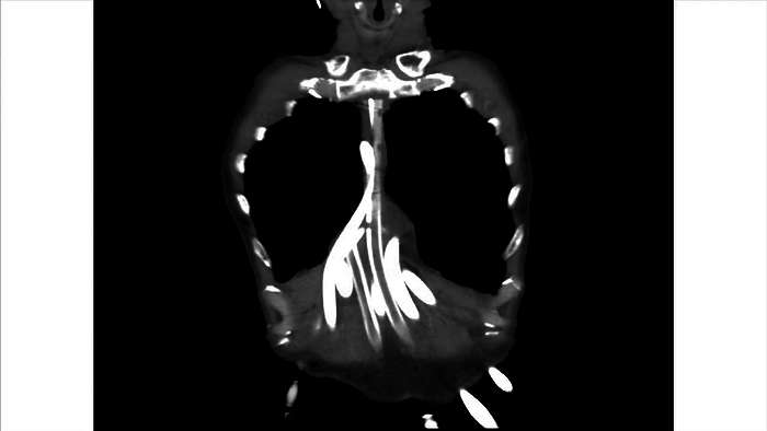 这是他的电脑断层扫描,理论上,胸腔里应该有一颗心脏,可是现在没有心脏,只看到一些管子。