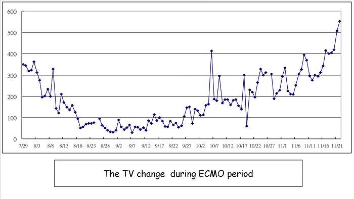 他用了117天叶克膜。这个图可以看得很清楚,差不多长达一个月,他的肺通气量不到100cc。不过,最后还是慢慢恢复了。