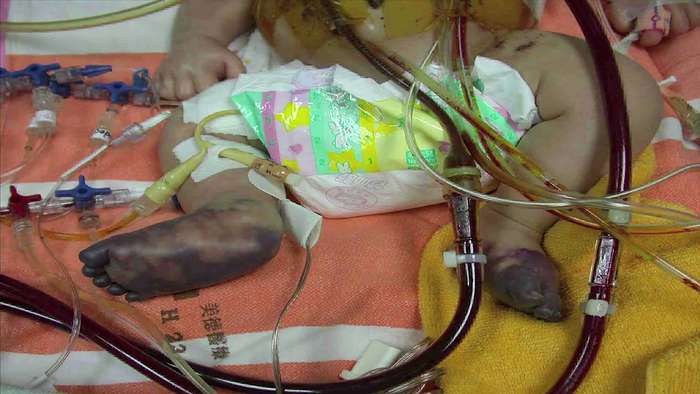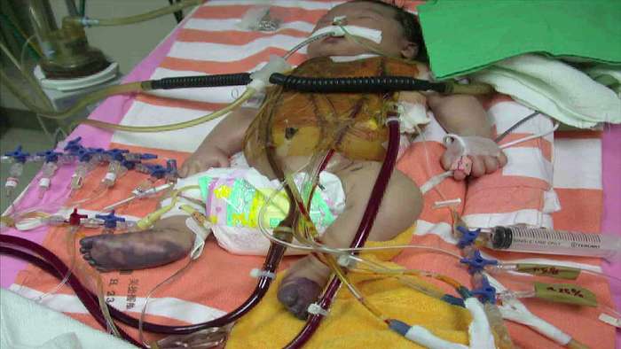 这是一个出生一个半月、先天性心脏病的婴儿,心脏手术以后,没有办法脱离心肺机,所以就装了叶克膜。