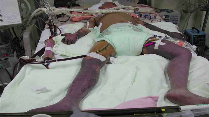 这是一个七岁的男孩,得了肺炎双球菌败血症,引起呼吸窘迫,后来装了叶克膜。